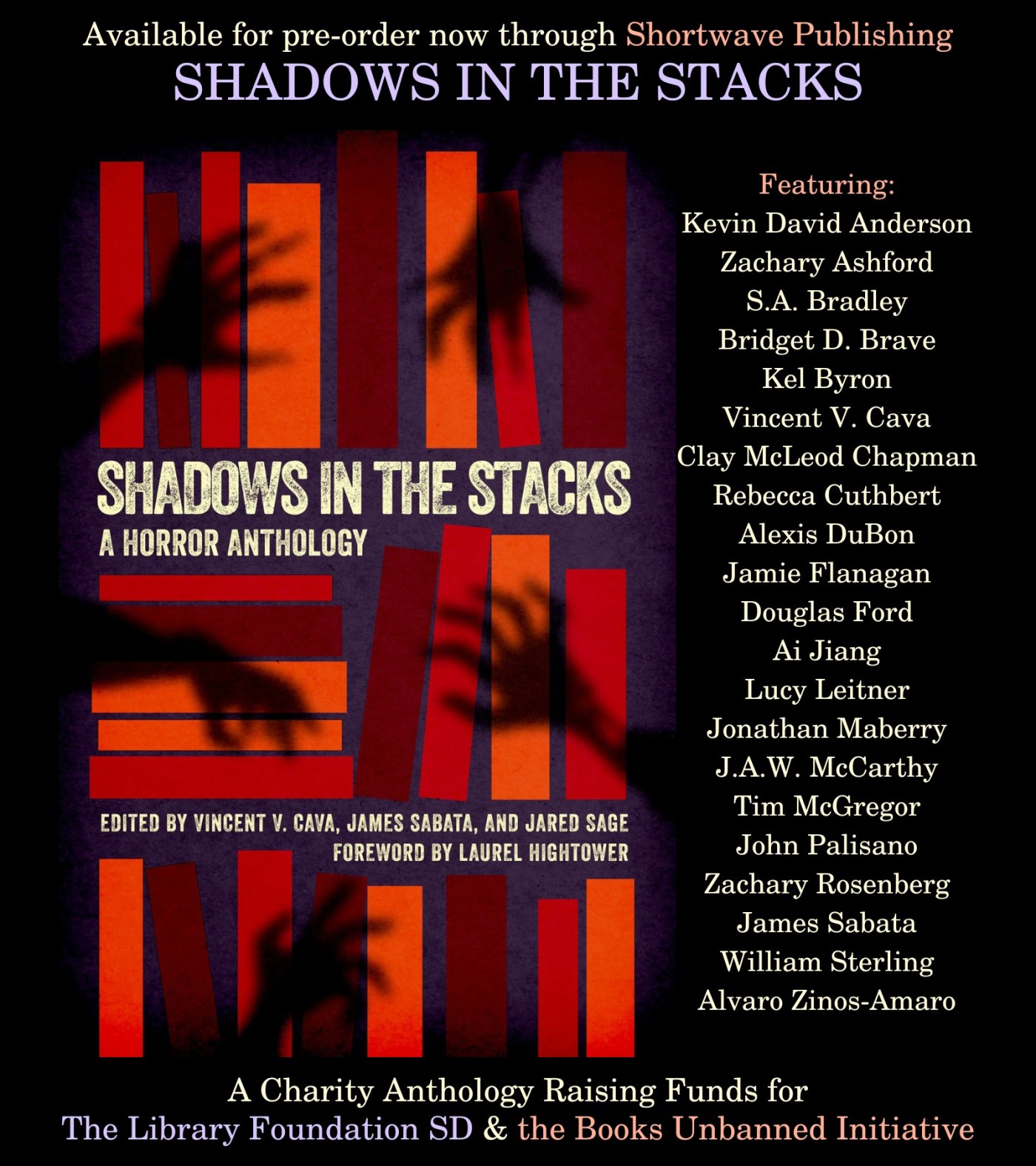 A: Shadows in the Stacks is a charity horror anthology that is a part of our horror-themed fundraiser Spirited Giving. Spirited Giving takes place May 29th at the San Diego Central Library and features author readings, live performances, and book signings, with ticket sales raising money for the Library Foundation SD and the Books Unbanned Initiative.