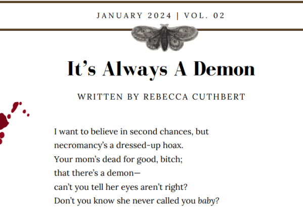 “Cuthbert’s chapbook celebrates the domestic, seemingly delicate spheres of women’s lives. From house witches to cryptids to body horror, this collection probes the edges of the speculative poetry genre. Supple and lyrical, these poems are cunning, intelligent, and tender.”