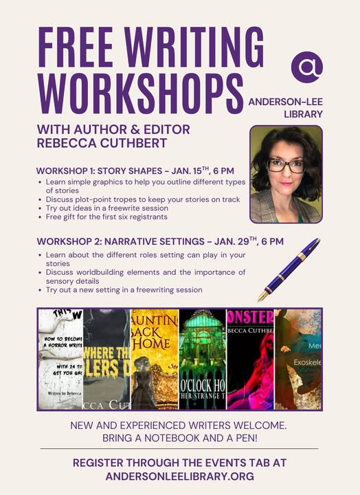 –Developing Narrative Setting – Writing workshop with instruction, activities, and refreshments, Anderson-Lee Library, Silver Creek, NY, Thursday, Jan. 29, 6 p.m. (Live event, Public Welcome, Registration Link Coming Soon!)