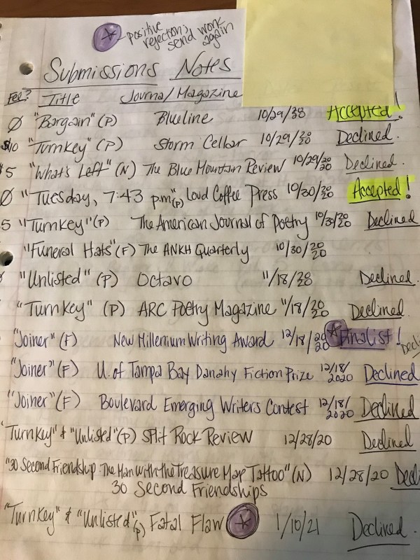 Pic: This is how I keep track of submissions. Low tech but effective.